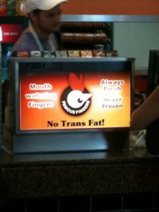 I USA är man biggest in the world – även i kroppshyddan. Har varit i Florida en vecka på semester och slagits av hur många som är väldigt feta. Fetmaepidemin startade i USA och den håller fortsatt nationen i ett stadigt grepp, trots enorma informationskampanjer. Antalet feta är 34 procent, antalet överviktiga nästan lika många. Helt otroliga siffror. Epidemin kostar amerikanerna 550 miljarder kronor per år och drar ner tillväxten, förutom allt lidande det orsakar. Problemet är hela matkulturen, inte minst det enorma intaget av söt mat och dryck. Den massiva reklamen har en stor skuld, mot den har hälsokampanjer inte en chans. Och så rör sig medelamerikanen alldeles för lite. Inte bara kör de bil överallt, på nöjesparkerna sågs mängder av permobiler med feta människor, som alltså inte kunde gå mellan attraktionerna. Det är tragiskt att se och tioåriga dottern trodde knappt sina ögon. I det sammanhanget är det rena hånet när hamburgerställena sätter upp reklam med “fritt från transfetter”. Visst, transfetter är ett problem men ett löjligt litet sådant i USA vid sidan av allt “vanligt” fett och socker man vräker i sig. Reklam som den på bilden är bedrägligt, den tar bort fokus från de verkliga problemen och skapar en illusion av att man med en liten justering (transfetterna) kan fortsätta som vanligt.