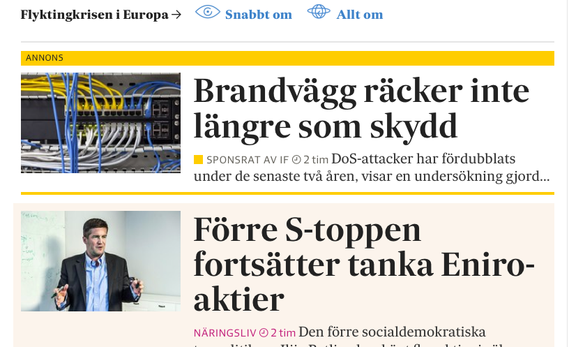 Reklam är köpta budskap och ska gå att känna igen. Reklam har sitt existensberättigande men ska inte gå att blanda ihop med redaktionella budskap, vare sig det handlar om en tidningsartikel eller en blogg. Det här kan tyckas självklart – och borde vara det – men det finns ändå en del som tycker att en sådan inställning tillhör en förgången tidsålder. Stora tidningshus, som man trodde var mer rädda om sin trovärdighet, flyttar nu bit för bit fram sina positioner. Aftonbladet har startat en särskild redaktion för ”branded content”, Partnersstudion, där Telia bland annat ska betala en USA-korrespondent som ska skriva om – just det – digitalisering. Ärevördiga Svenska Dagbladets webbsida (nedan) är också ett bevis på den tilltagande uppluckringen. Visst, det står annons men allt annat är exakt likadant som redaktionell text. Och det finns ett skäl till att Svenska Dagbladet går med på det. Skälet börj